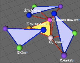 理想的なプロジェクトの状態。組織が研究開発プロジェクトに最適なリソースの割り当てを行っており、現場の研究開発者たちのモチベーション、社内外のコミュニケーションも良好である状態。(各要素が近い距離で密集している)